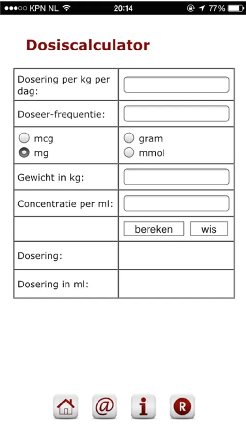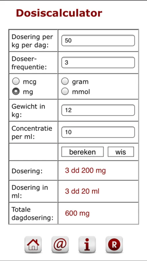 Met deze dosiscalculator kan eenvoudig de juiste dosering per gift worden berekend van een bepaald medicament. Voer de dosering per kg per dag in en de doseerfrequentie; de app berekent vervolgens de dosering per gift. Indien de concentratie wordt ingevuld, wordt ook het aantal ml berekend.