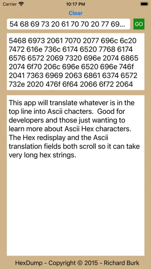 HexDump is a simple app that has one input field that takes a string of hex characters and converts them to a translated ASCII string. It displays in two output fields; one for the original hex string and the other for the translated ASCII string. Both of these output fields scroll so it can take very large strings.