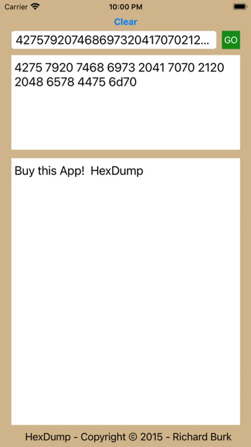 Just copy your Hex String from another place on your device and then go to the HexDump app and paste your string into the single input field and click on the "Go" button. You can also just type in a Hex String into the input field if you want.