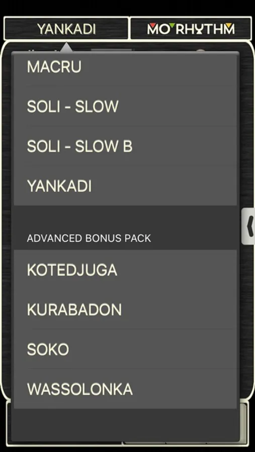 The Advanced level of rhythms include: Abondan, Dunungbe, Konkoba 1, Konkoba 2, Konowulen 2, Lekule, N'Goron, Soboninkum, Zaouli A, and Zaouli B.