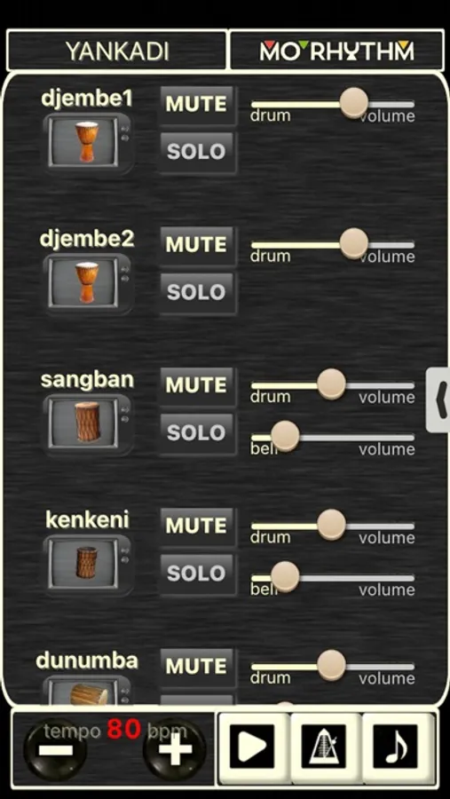 First, select the rhythm you want to practice. Then select the instruments you would like to play accompany you while you practice. Select the tempo and then press Play. You will hear the djembe signal at the start of each rhythm and then you can begin playing your drum along to the instruments you have selected.