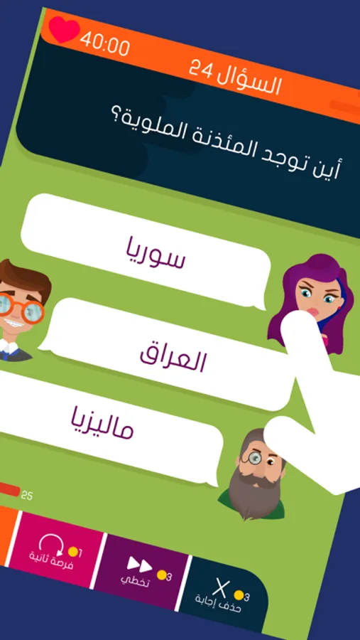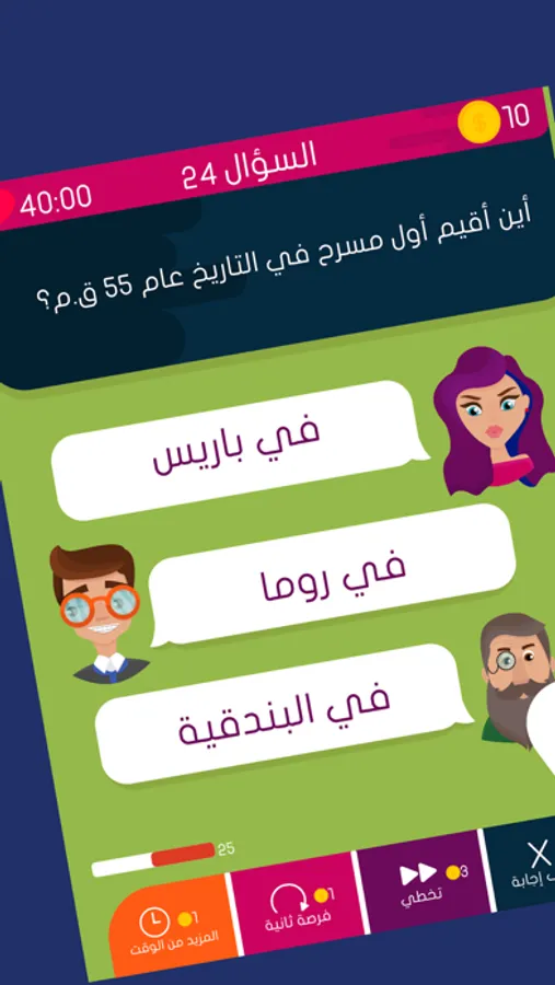 هناك وسائل مساعدة (زيادة الوقت، حذف اجابة، فرصة ثانية أو تخطي المرحلة) في حال عجزت عن حل سؤال، اكسب النقود من خلال الاجابة عن الاسئلة حتى تستطيع استخدامها في تفعيل هذه الوسائل.