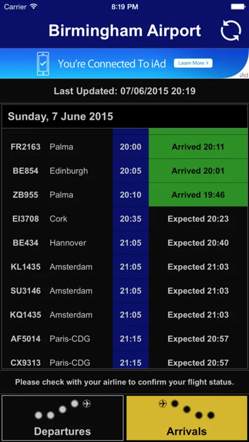 Displays current 'Departures' and 'Arrivals' at Birmingham Airport (BHX)