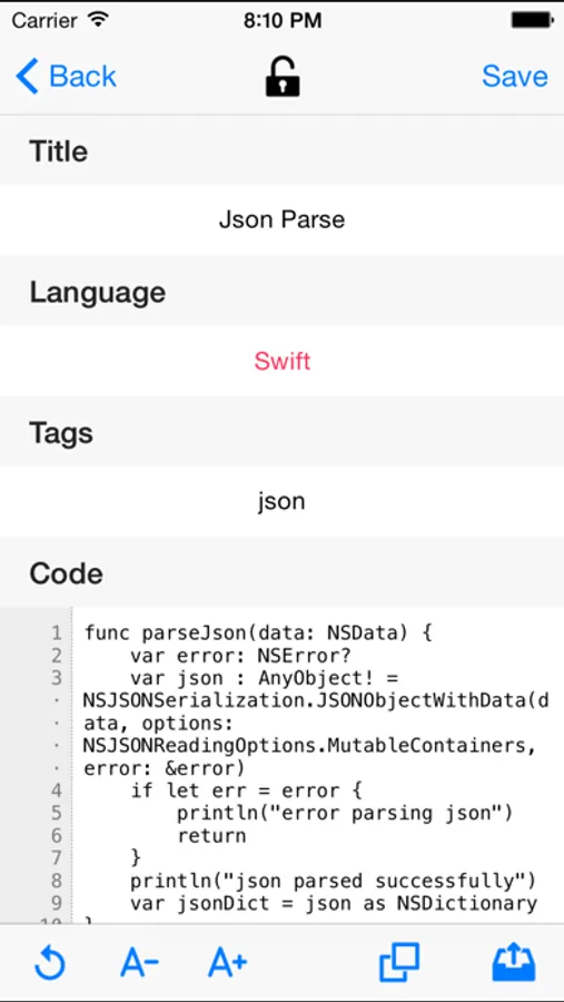 Stores your code snippets safely on your iCloud and you can access it from your iPhone or iPad.