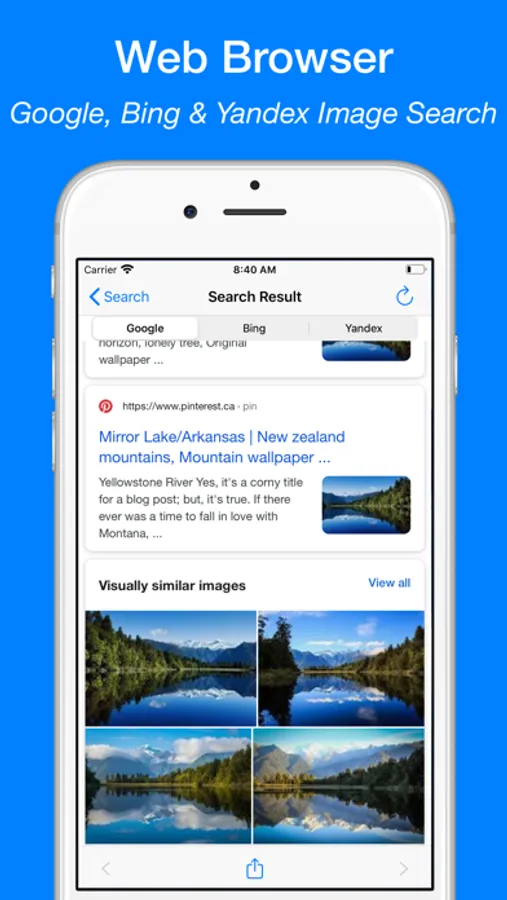 This app use Google, Bing, Yandex and TinEye in the in-app web browser. But the app is not endorsed by or affiliated with any of these search engines.