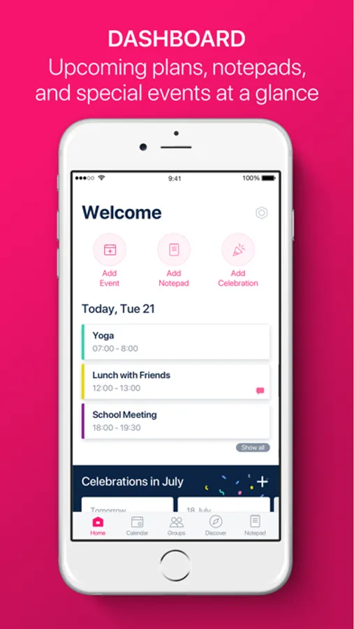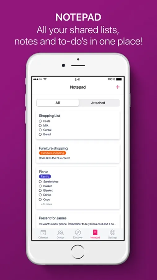 • Easily create and share to-do lists (e.g. shopping list, notes) to attach to an event and/or share with a group.