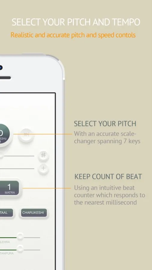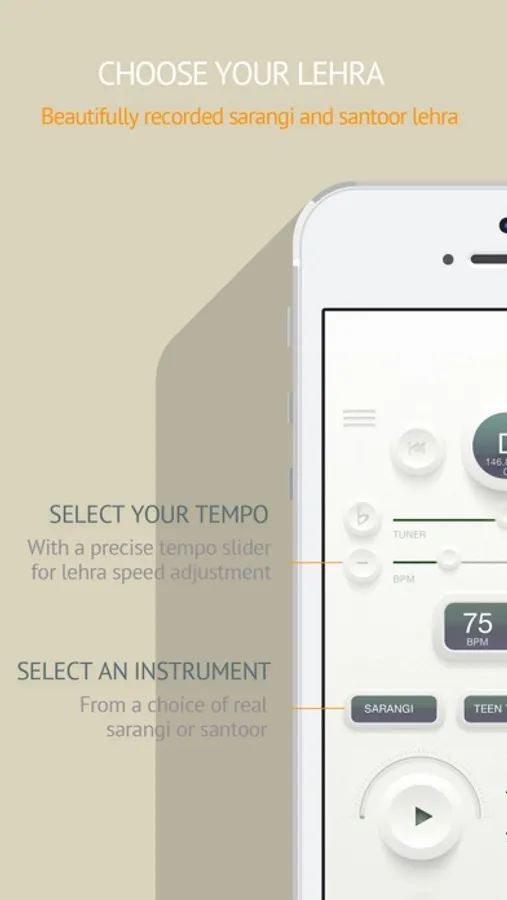 Lehra Studio's clean and clever interface, with built-in features, packs a punch. This includes a scale changer to allow pitch manipulation of the lehra from A# right upto the E semitone. The interface has a fine tune slider, which allows the tabla player to tune the lehra according to their individual tabla sound. The Lehra Studio tempo controller ranges from 30 to 240 beats per minute. The beat counter is accurate and assists the tabla player with keeping precise tempo. The lehra and tanpura volume bars allow for fine manipulation of volume according to every tabla player's unique preference.