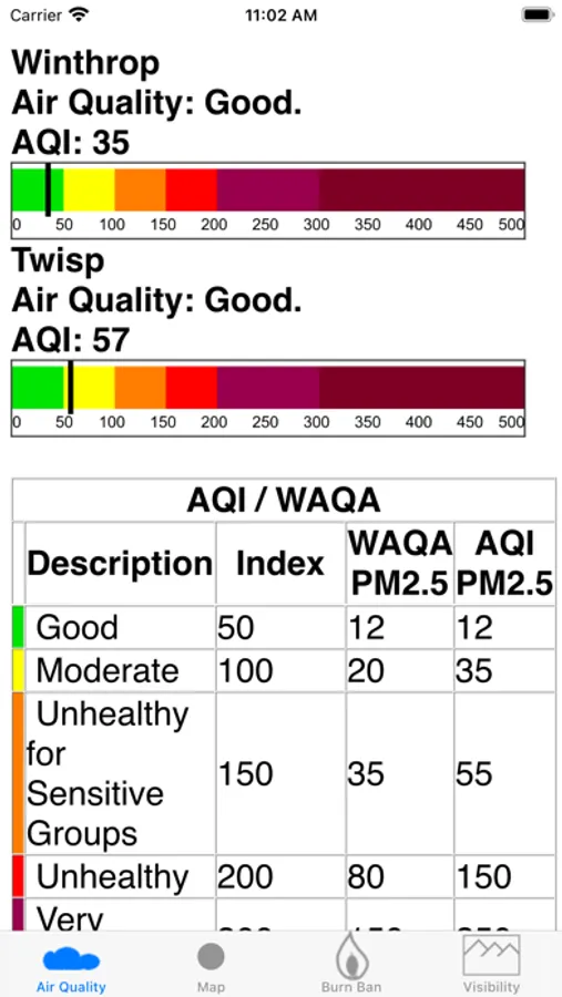View current air quality conditions as recorded by the air monitoring stations in Winthrop and Twisp. The stations are maintained by the Washington State Department of Ecology.