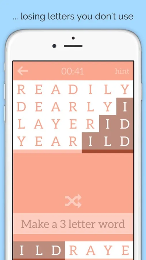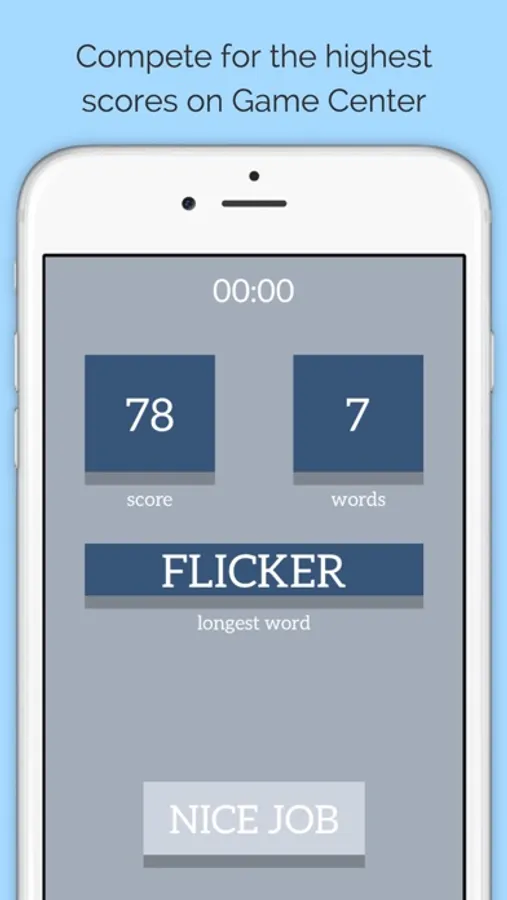 Blitz mode is a race against the clock for points. As the timer ticks away more and more letters are revealed. Continue making as many words as you can (three letters or longer) until time runs out. Longer words are worth more points (obviously) and there is ALWAYS a way to make a word using all available letters. See if you have what it takes to sit atop the Game Center blitz leaderboard!