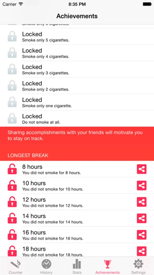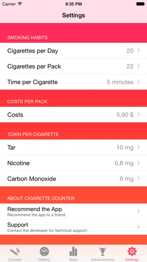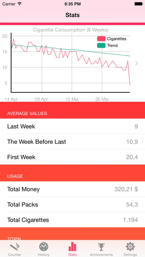 This app lets you count the cigarettes you have smoked. It will chart your cigarette consumption and calculate a lot of interesting statistics. It will not make you quit smoking but knowing how much you really smoke is an important step of the goal to quit smoking.