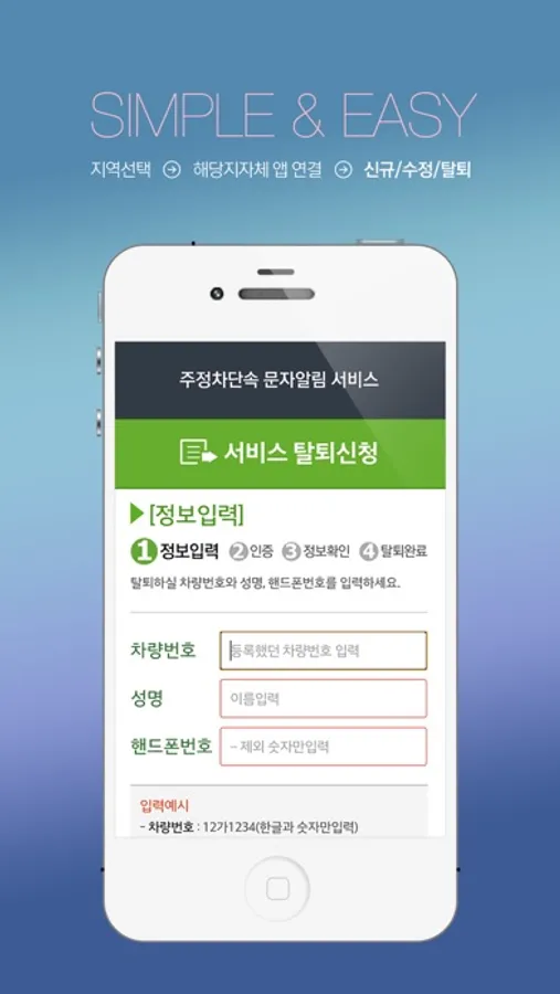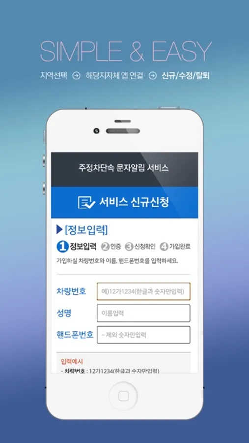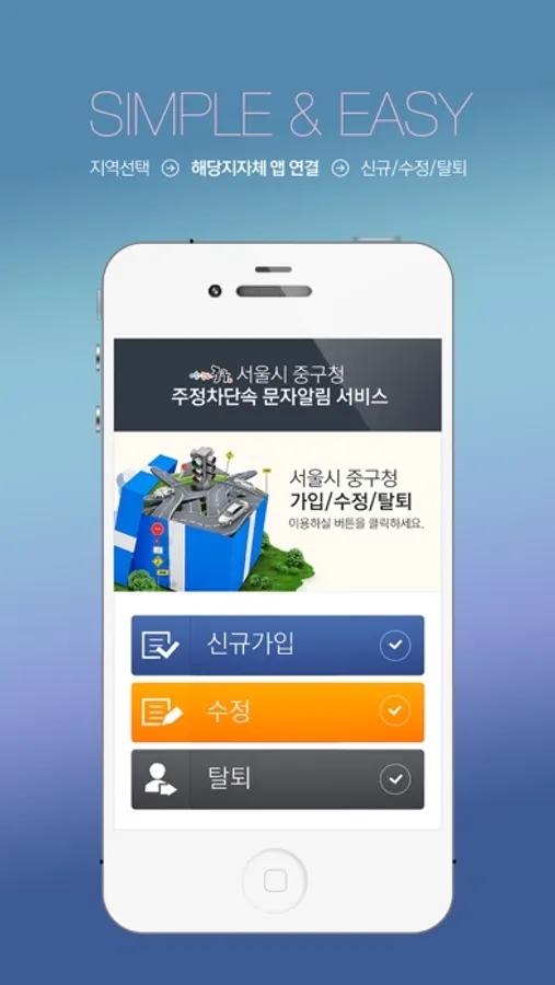 주정차단속알림 서비스는 불법주정차지역의 차량에 대한 CCTV(고정식,이동식)의 단속내용이 신청자조회시스템과 연동하여 운전자에게 불법주정차에 대한 사전경고 안내 메시지를 발송하여 차량의 신속한 자진 이동을 유도하고, 주정차 질서를 정착시켜주는 솔루션입니다.