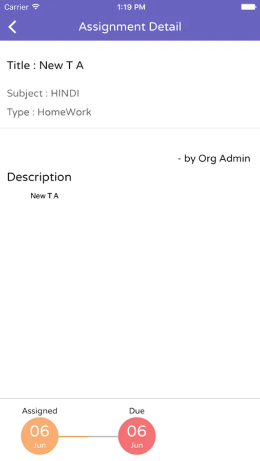 Assignment: Staff is provided with mobile and web application to create assignment and they can post their assignment, homework, projects or classwork from anywhere anytime, along with the detail of the subject, due date, also they can attach the supportive documents (can be image, docs, or pdf). Parent will receive notification as SMS, Push notification & Email, whenever an new assignment is created by the staff for their ward.