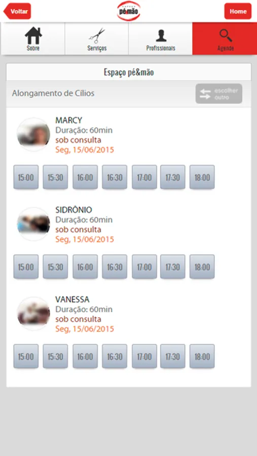 Basta selecionar o profissional e o horário de sua preferência e pronto! O Pedido de Agendamento é realizado!