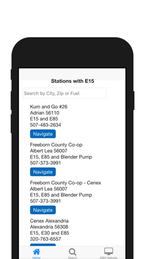 This app locates gas stations in Minnesota that sell biofuels. You can search by type of biofuel: E15, E85 and blends. You can also search all stations. The 'Navigate' button under each station listing opens the Map app with directions to that station.