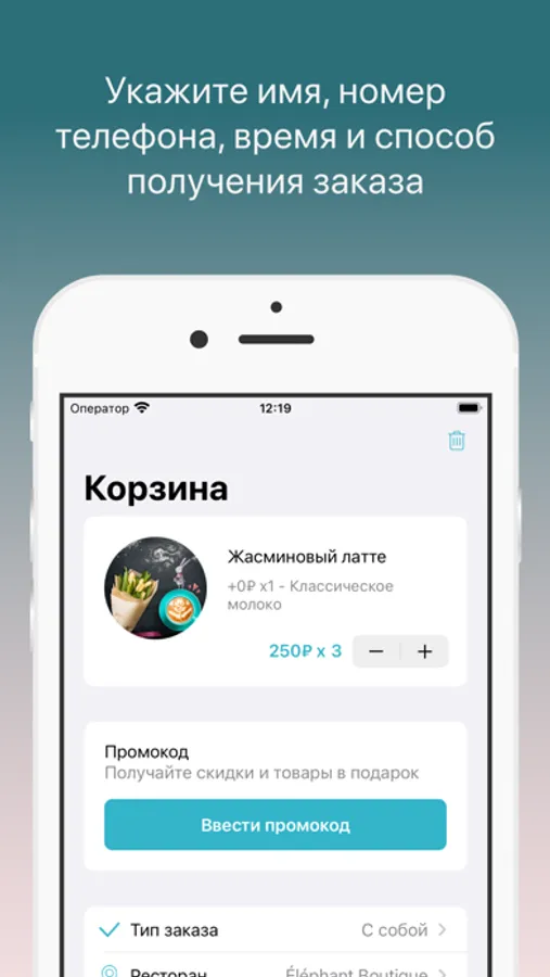 Как сделать заказ в приложении “Кофе в Геленджике”: выберите понравившиеся позиции из меню, добавьте их в корзину и перейдите на экран оформления заказа (по нажатию на иконку корзины).