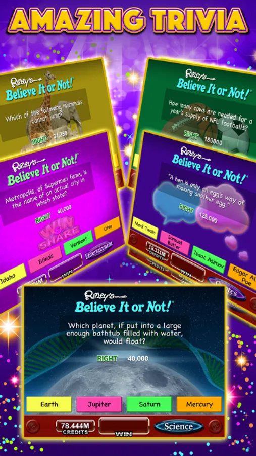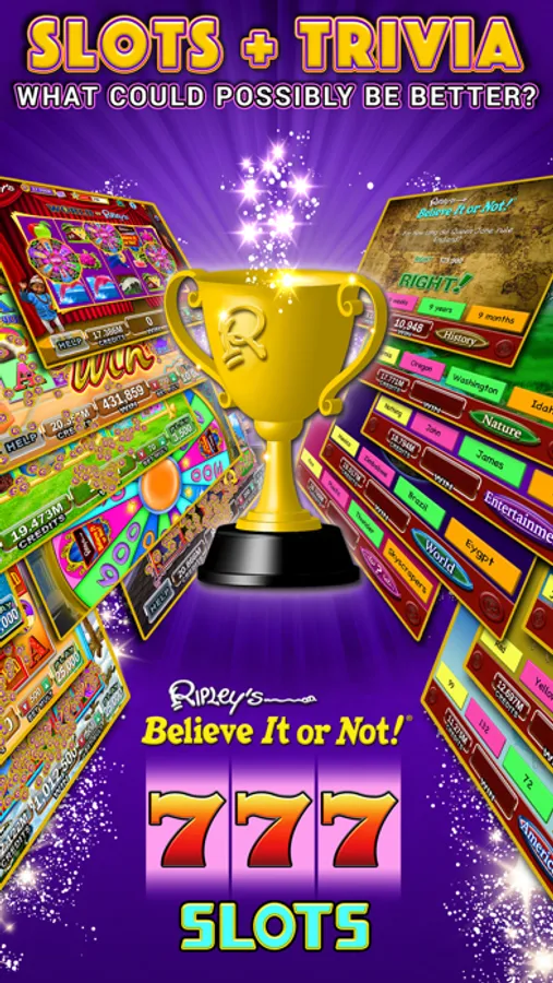 Double the Fun! Believe it or not, with Ripley’s Slots you can have the excitement of Las Vegas-style casino slots with awesome bonus games AND new quiz bonuses based on fun, cool and weird facts. Join the slots party with fun machines created by professional Vegas slot designers!