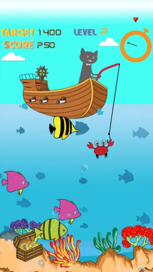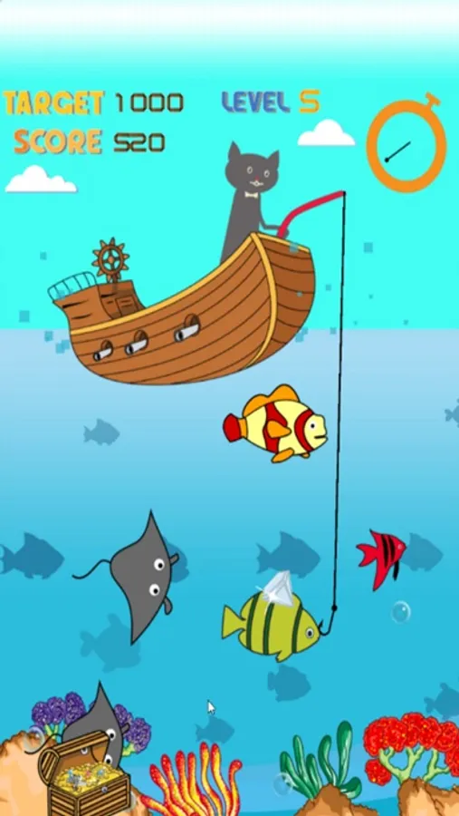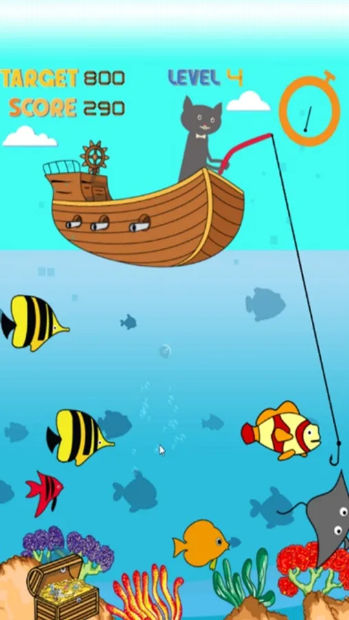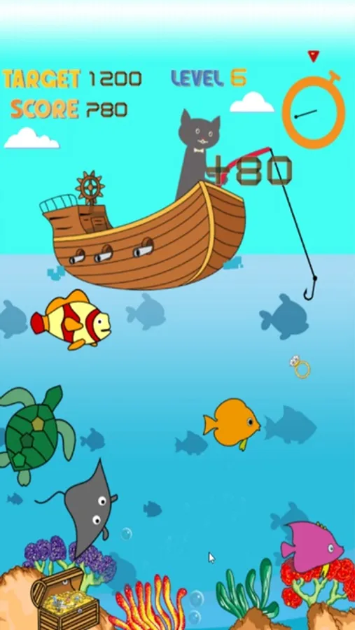 Kids can tap the screen to help the cat to drop the hook down and release to pull up. The catch is similar to a fishing magnetic. Hauling as much more fish as they can. While playing in each level has a random treasure bonus. The Children will win score over the target on each level.