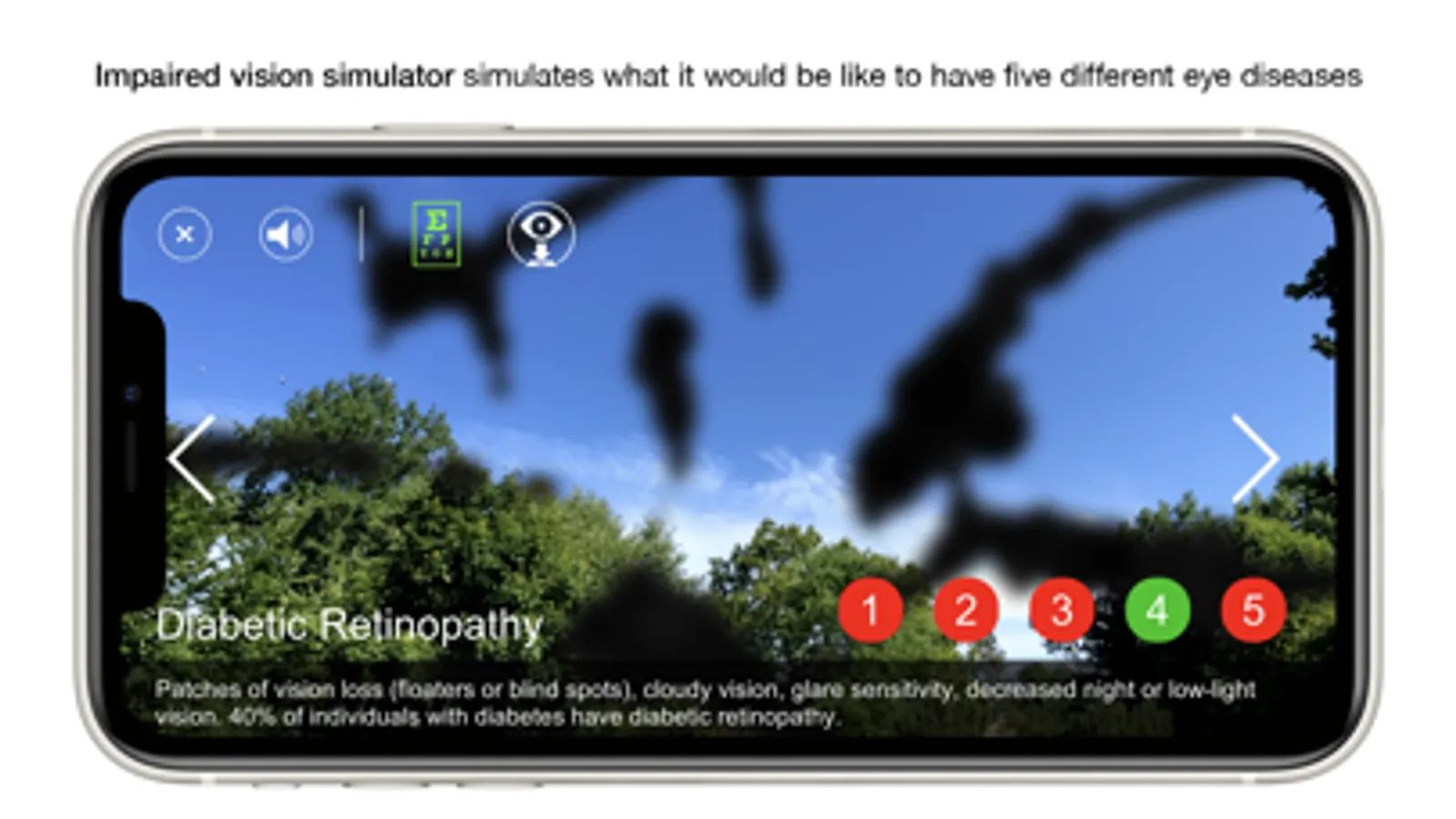 Download and launch the app, and aim the vision simulator at the image you want to see through the eyes of someone with vision challenges. Or, aim your device’s camera at any flat surface such as the floor or a table, and experience a virtual walk-through of a human eye.