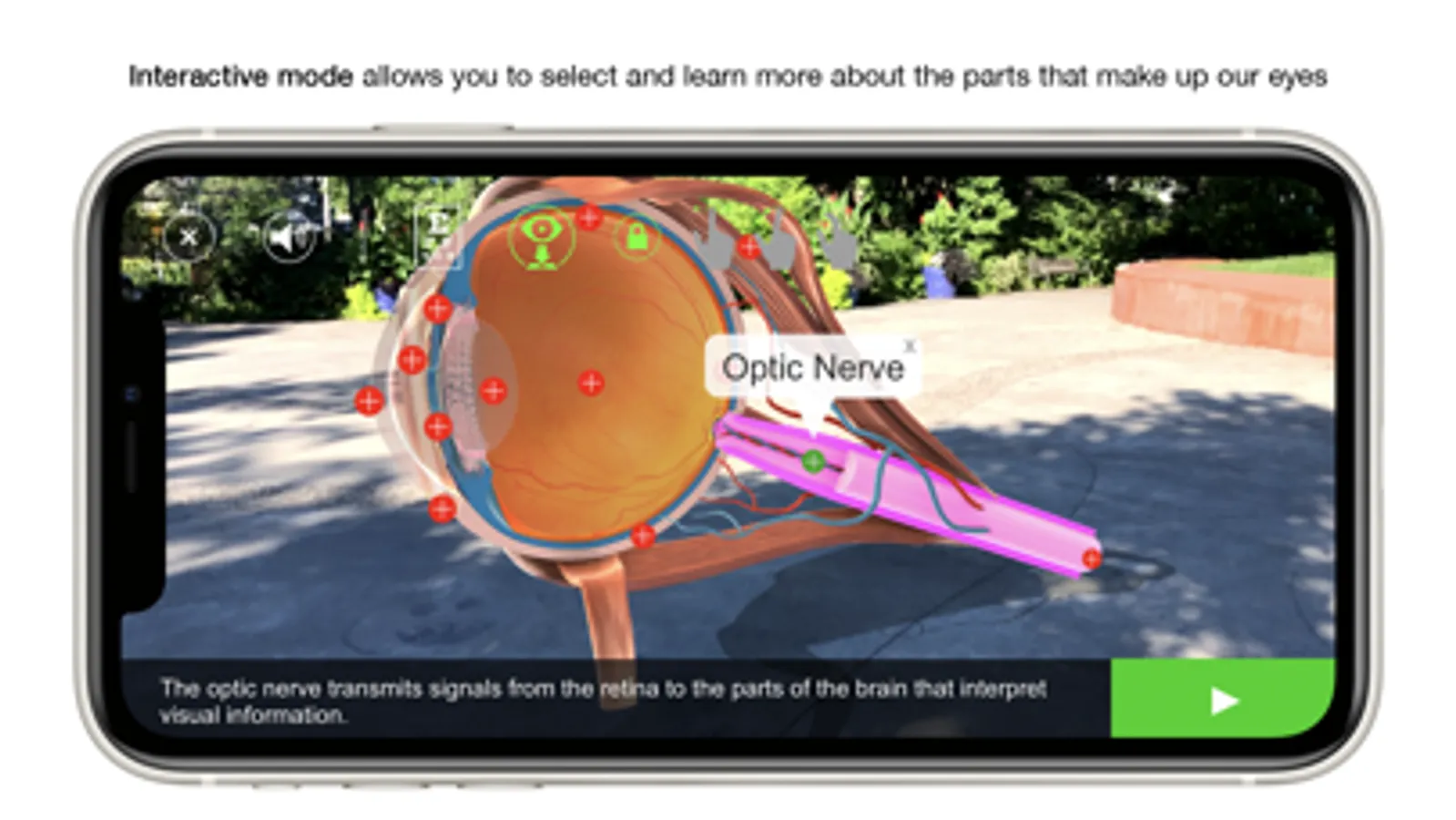 AR Eye has three modes: an animation mode that explains how our vision works, an interactive mode that allows you to select and learn more about the parts that make up our eyes and an impaired vision simulator which simulates what it would be like to have five different eye diseases.