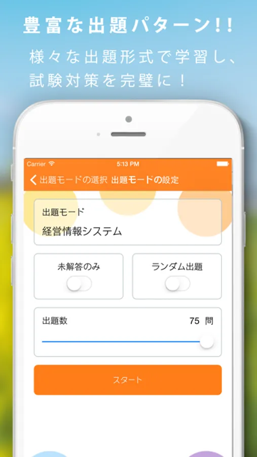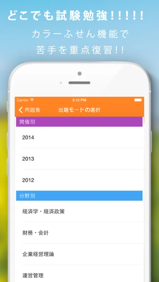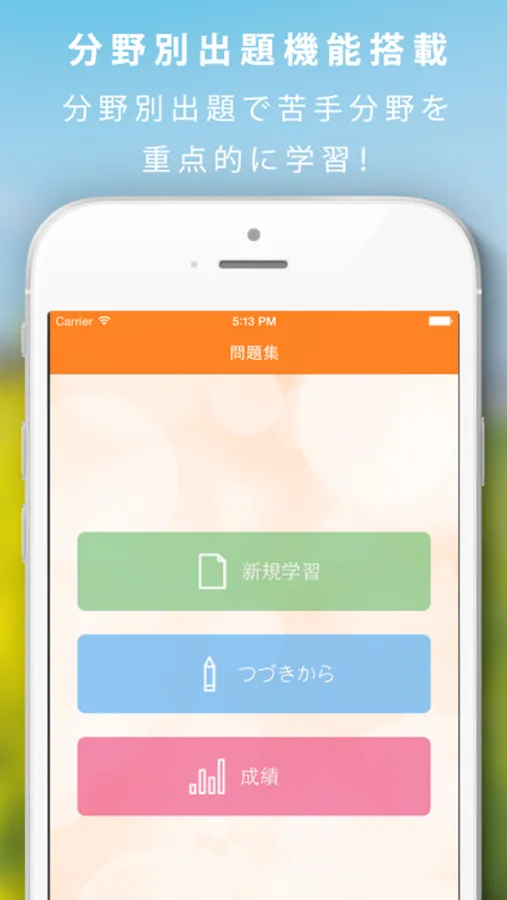 開催別、分野別、苦手な問題などから独自の問題セットを作成することができ重要な項目を徹底的に勉強できます。復習用にカラー付箋(ふせん)を使用したり、間違い回数が多い問題だけを解けるのでスキマ時間に、いつでも、どこでも効率的な学習が可能です。成績機能も充実しており、解答率、正解率、分野ごとの分析されます。