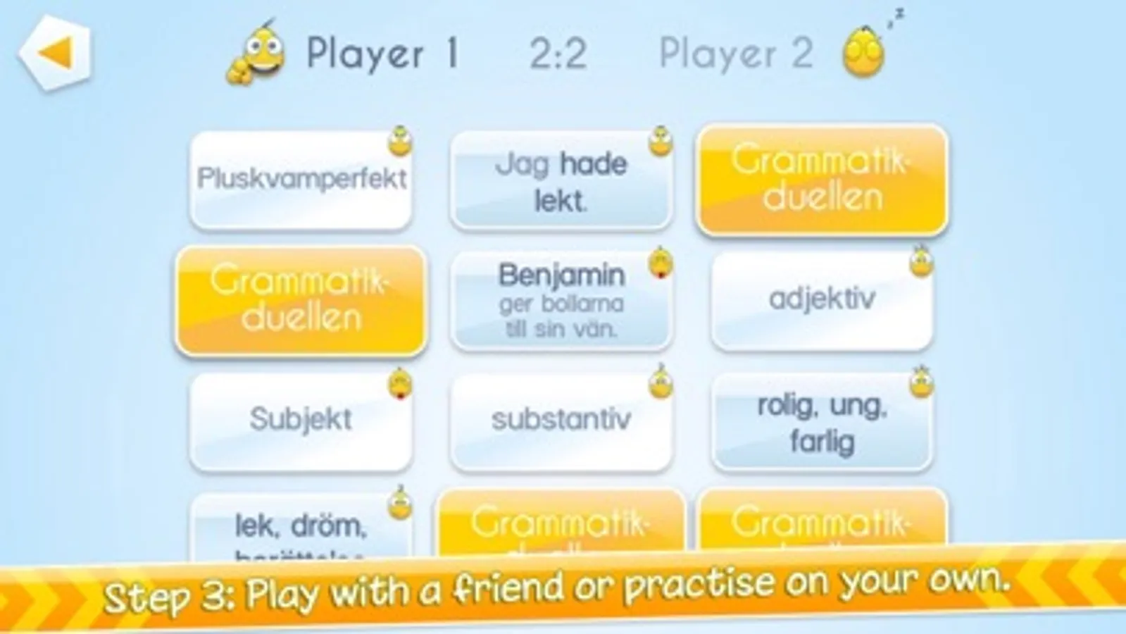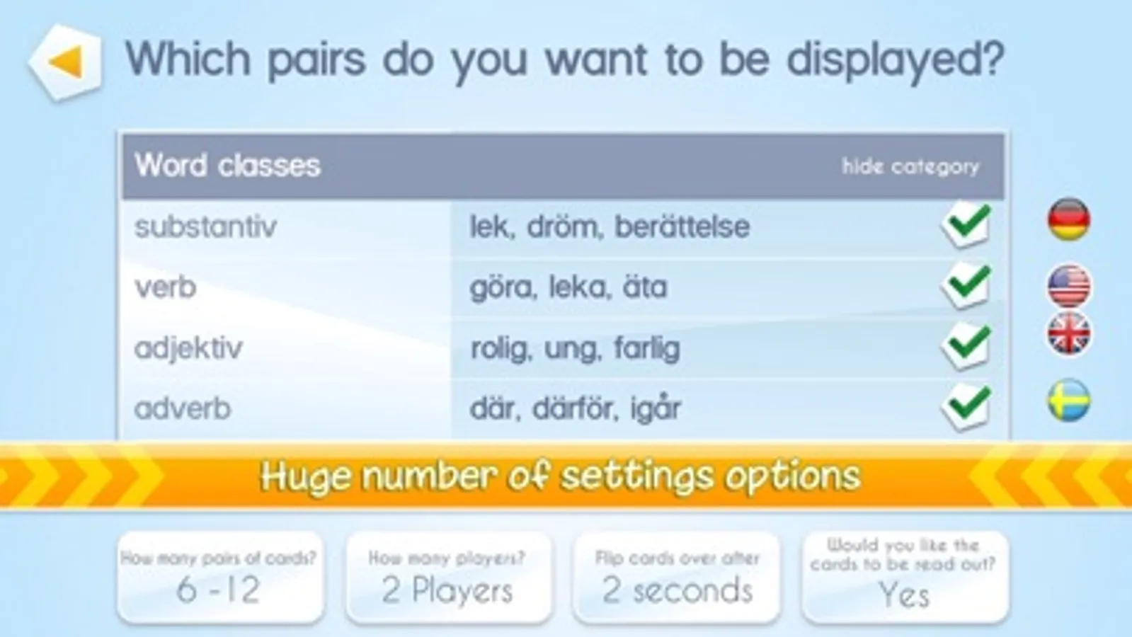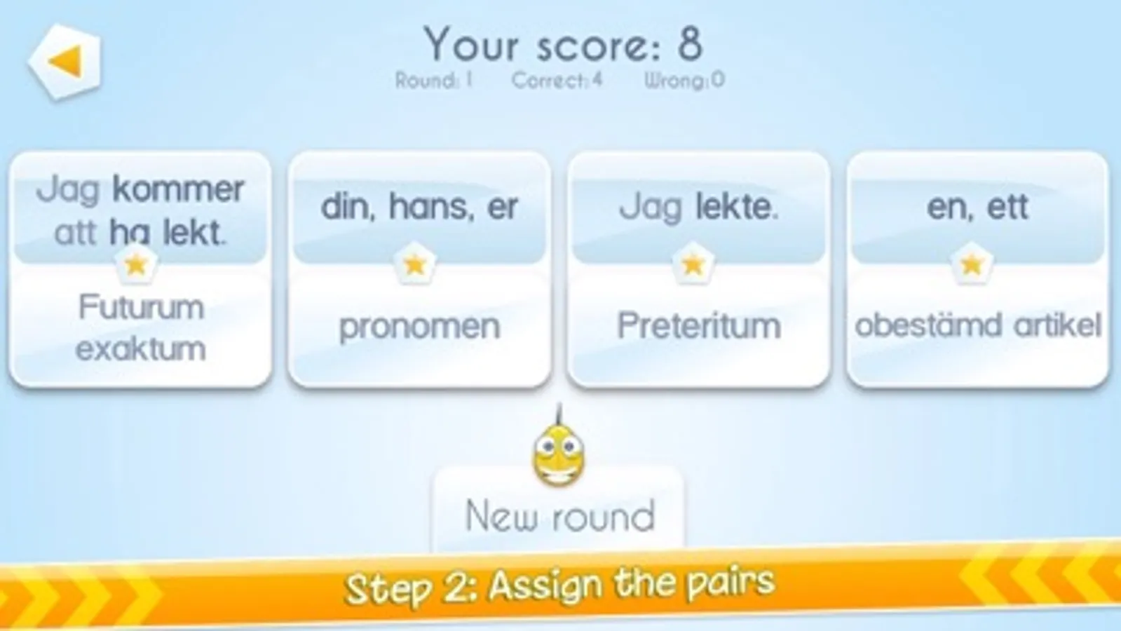This entertaining and educational matching game app helps you practice your Swedish grammar and spelling in a fun way. Whether you need to brush up on parts of speech, conjugation or declination, tenses and types of sentences - no matter what you need, the various grammatical areas can be combined with each other and practiced. With one click, the appropriate themes are chosen, easy as pie, and you can start right away. Matching pairs must be found, either by purely assigning terms to the proper categories (rolig = adjektiv| jag leker = presens) or as a concentration-enhancing matching game.