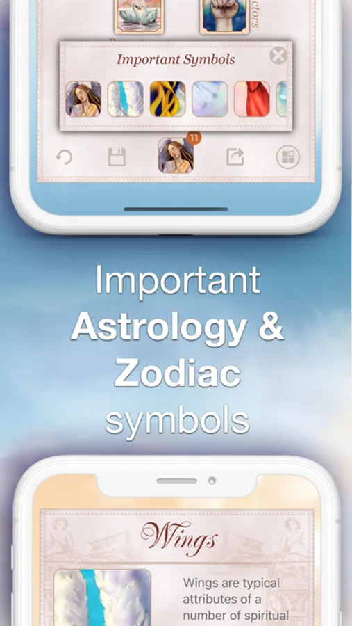 • Important astrology symbols found in the cards for each Tarot reading you make.