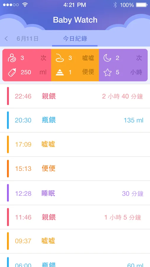 - 尿布:紀錄換尿布的時間、次數,包括噓噓及便便