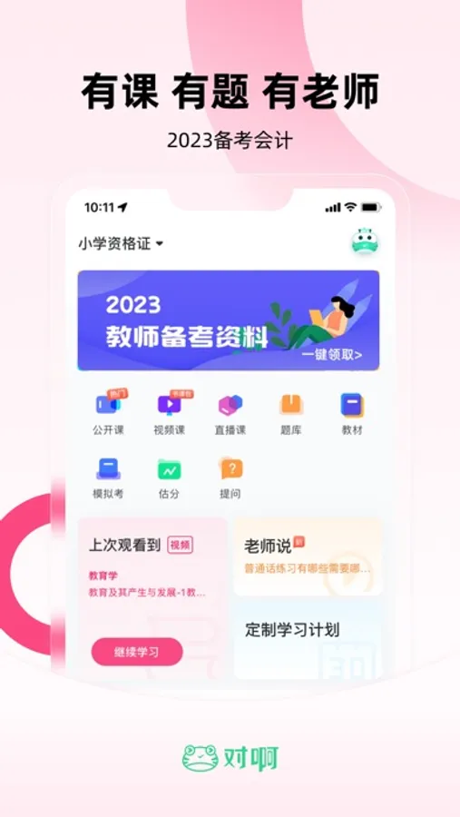 家族产品:对啊课堂、会计随身学、会计职称随身学、注册会计随身学、会计帮、会计从业资格证对题库、会计职称对题库、证券从业对题库、教师资格证随身学、教师帮、教师资格证对题库、设计君、英语四级君、英语六级君、证券从业随身学、银行从业随身学、基金从业随身学、建造师随身学、公务员考试随身学、消防工程师随身学、司法考试随身学