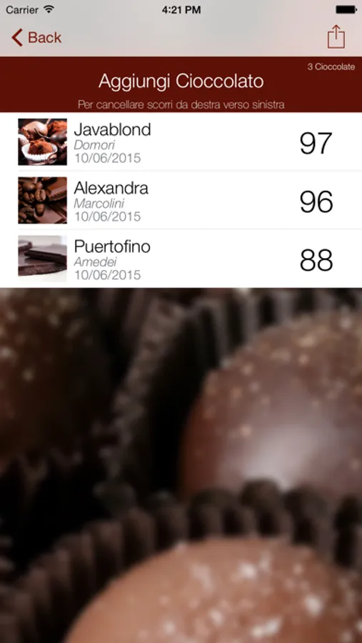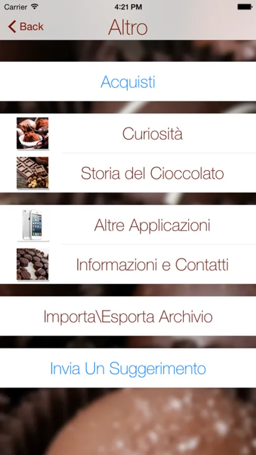 - Importa/Esporta Archivio : potrai esportare ed importare il tuo archivio su diversi dispositivi Apple, in modo da avere il tuo elenco sempre aggiornato e conservare una copia dei tuoi Cioccolati.