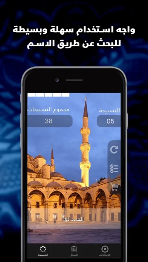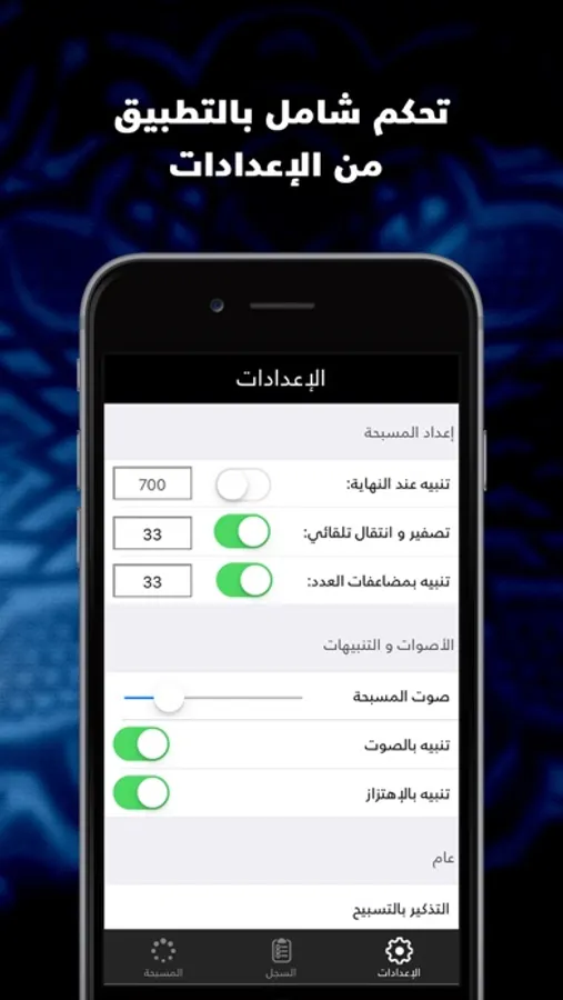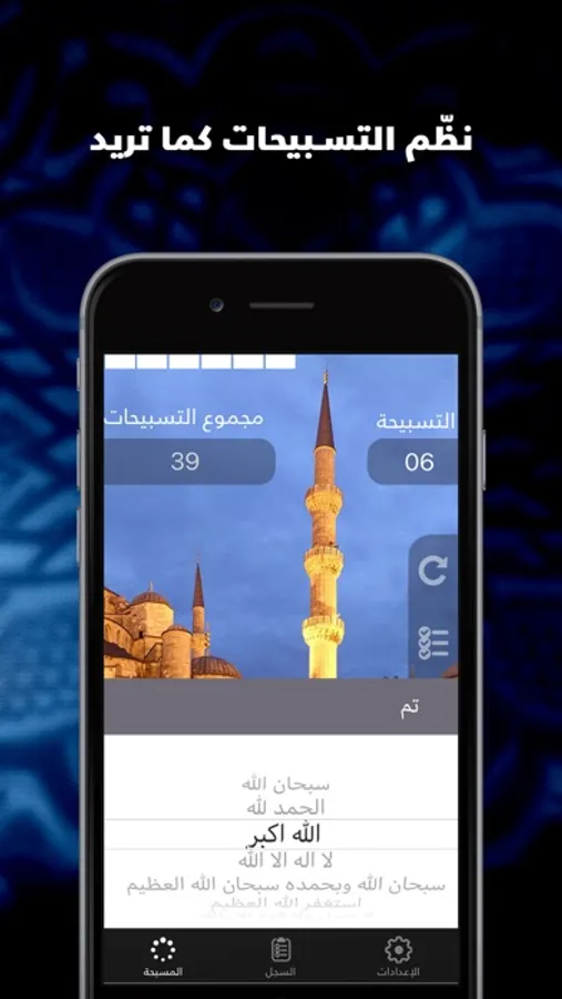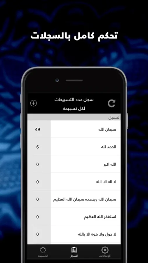 - عداد التسبيحات يحفظ عدد التكرارات للمسبحة.