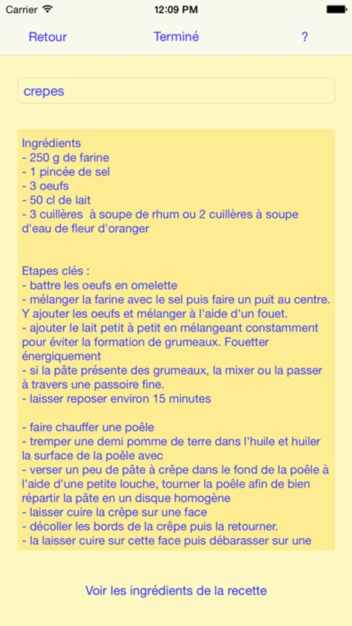 Vous pouvez enregistrer vos recettes préférées et l'application identifiera automatiquement les ingrédients. En préparant votre liste d'achats, une sélection de la recette recopie les ingrédients qui vous manquent dans votre liste de courses.