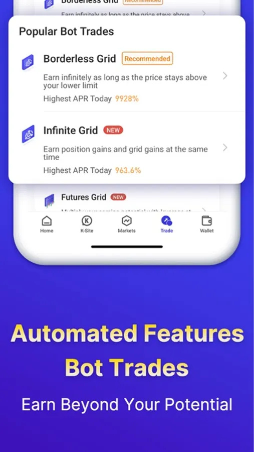 We also offer automated trading services such as Futures Grid Trading, Bot Trading (Interval, Borderless, Two-Way Grid), and passive savings income features (Auto Invest, Rebalancing) to help you earn beyond what is possible. Our automated services are tested daily to maximise your experience.