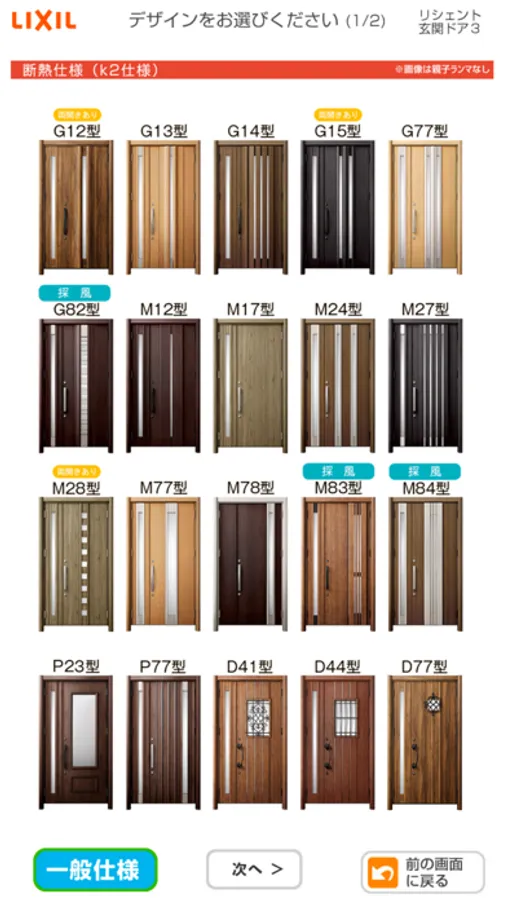 ⑥既存の玄関が片開きか片袖・親子か確認し、新しく取り付ける玄関をランマ付・ランマ無にするか選択します。