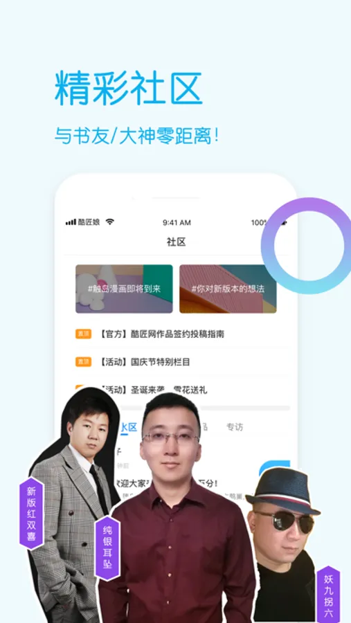 【实时互动】酷匠APP提供了多种用户之间的互动功能,你可以在书评区与作者或者其他读者互动,还可以在社区中分享你感兴趣的话题哦!