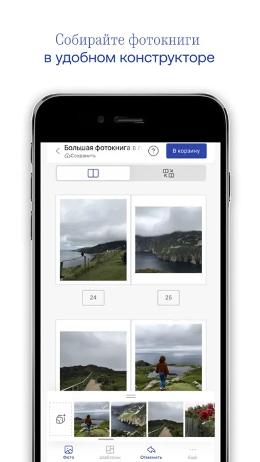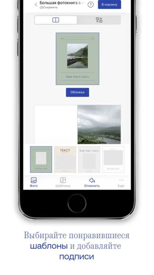 Все просто: выберите фотокнигу, подставьте снимки в понравившиеся шаблоны и добавьте подписи. Проекты автоматически сохраняются в приложении — если телефон разрядится, вам не придется начинать сначала.