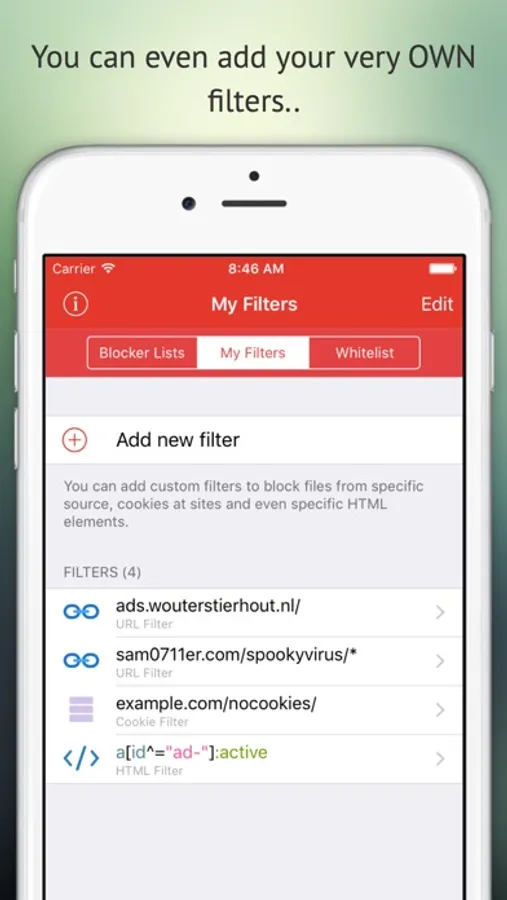* CUSTOM FILTERS: Want to block your own sites, files or even specific HTML elements? You can do that with a click of a button!