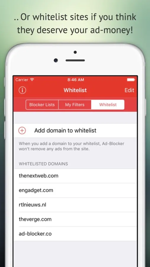 * WHITELIST SITES: You think a websites deserves your ad-money? Ad-Blocker allows you to add sites to your very own whitelist so the ads on that site won't be blocked.
