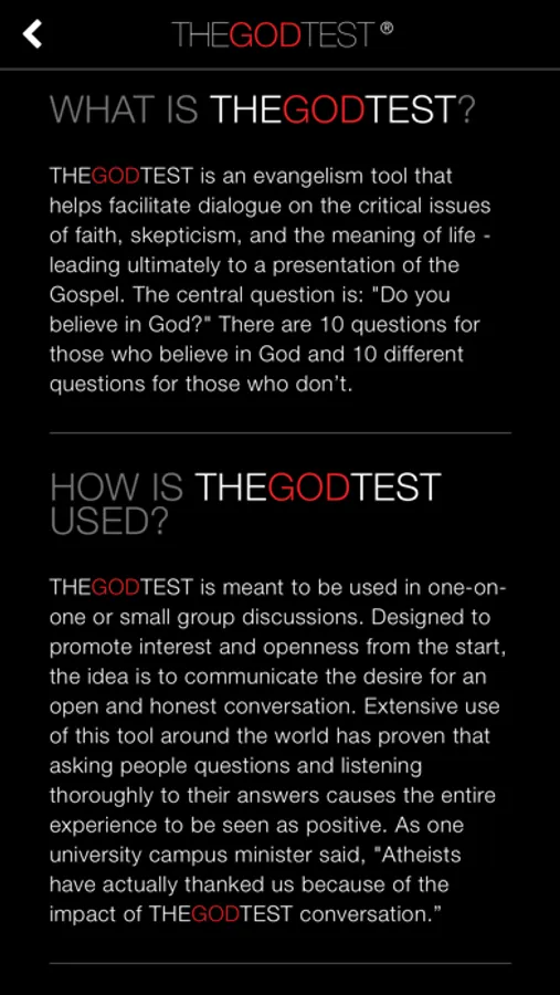 THEGODTEST is meant to be used in one-on-one or small group discussions. Designed to promote interest and openness from the start, the idea is to communicate the desire for an open and honest conversation. Extensive use of this tool around the world has proven that asking people questions and listening thoroughly to their answers causes the entire experience to be seen as positive. As one university campus minister said, "Atheists have actually thanked us because of the impact ofTHEGODTEST conversation.”