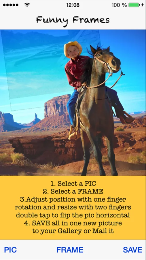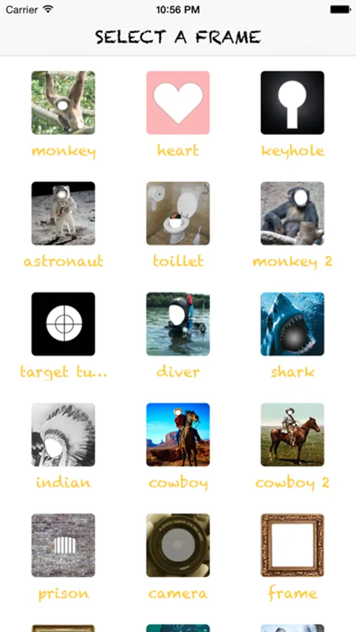 With FUNNY FRAMES you can select different frames, covers and hole images for your photos.