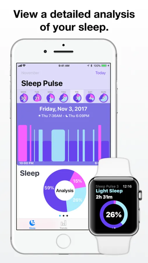 • iPhone Independent, away from your iPhone for a night? No problem Sleep Pulse 3 analyzes your full sleep without your iPhone, when connected it will sync the data. Get your sleep report directly on your Apple Watch.