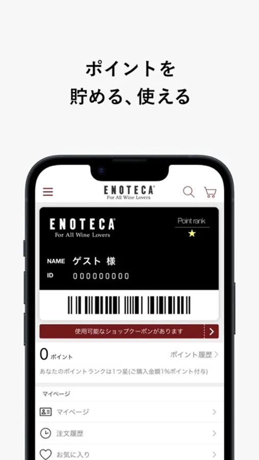 ポイントは全国のワインショップおよびオンライン共通で、ご購入金額の1%を付与(※)。貯まったポイントは1ポイント=1円としてご利用いただけます。※付与率はランクによって変わります。