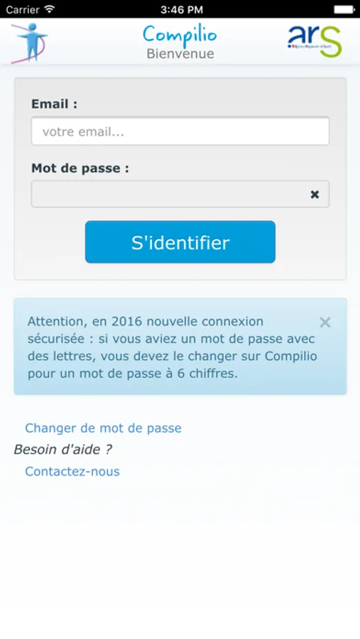 La connexion à Compilio mobile utilise le même identifiant (e-mail) et le même mot de passe que la connexion au site web Compilio.