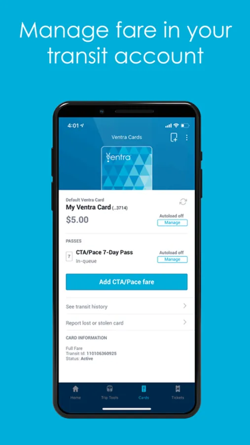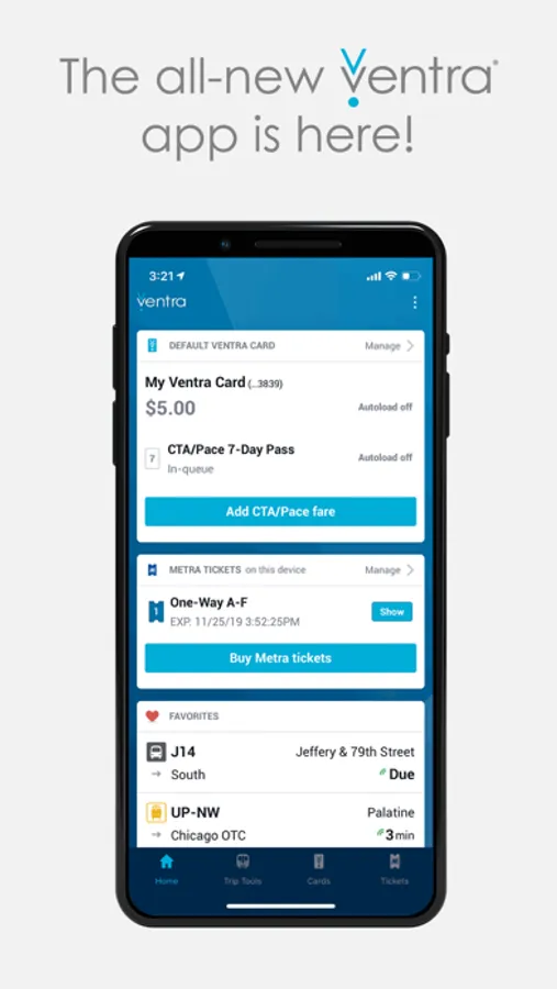 Use transit in and around all of Chicago: It's easy to manage and pay your fare on CTA, Metra and Pace buses and trains with the Ventra app. Find all the features you're used to on the Ventra website and more, including mobile ticketing for Metra trains!
