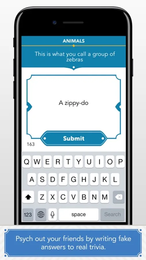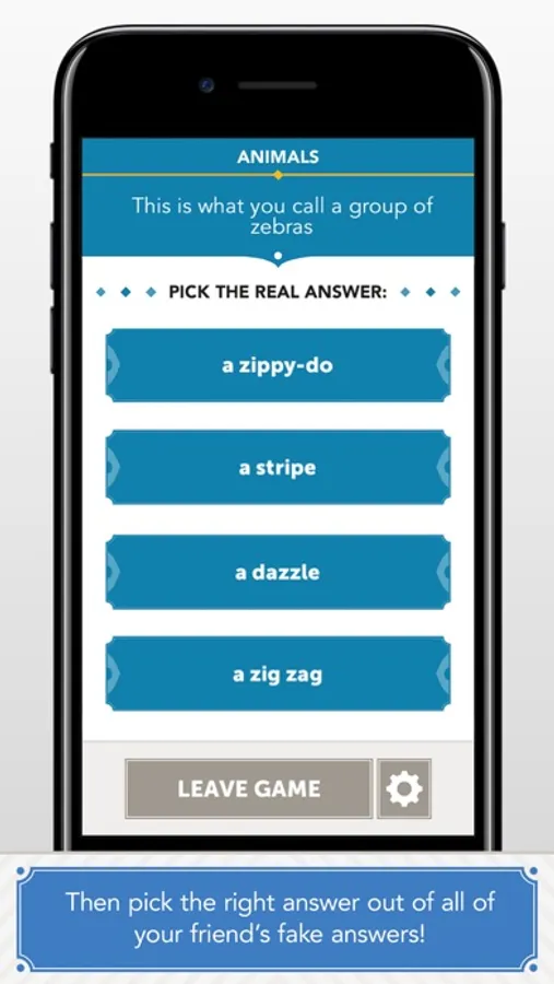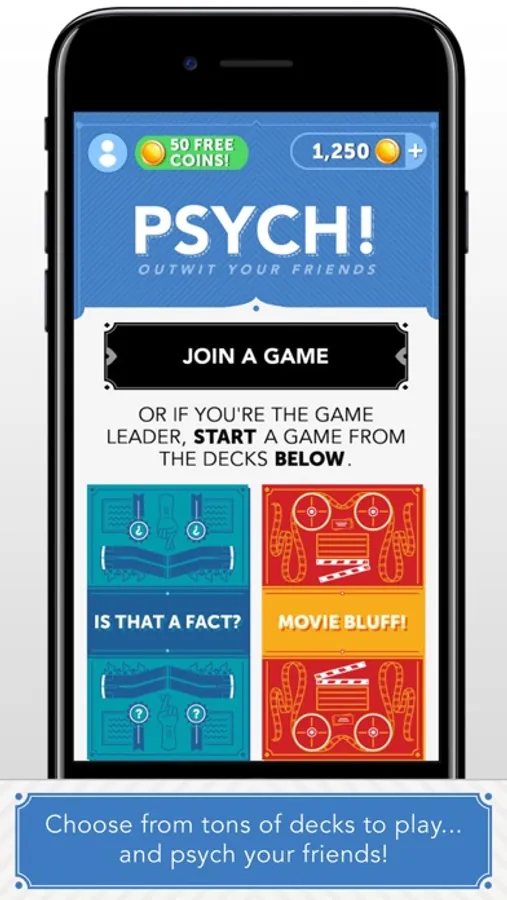 You can also play one of our trivia categories like “Word Up” or “Movie Bluff,” in which each player makes up fake answers to real trivia questions! Can you outwit your friends and choose the outrageous real answer among your friends’ fakes? Get points for choosing the right answer in this tricky guessing game and for each player you PSYCH! into choosing yours.