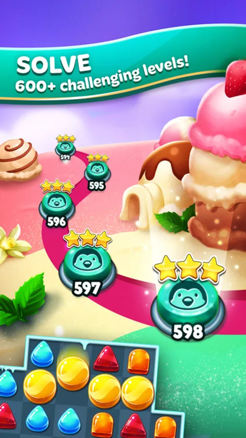 Match ice cream treats to break through cookie walls and multiplying jellies in this delicious adventure filled with tricky obstacles. Easy to learn, but difficult to master. Get ready for weekly events, sweet prizes, and SATISFYING CHALLENGES!