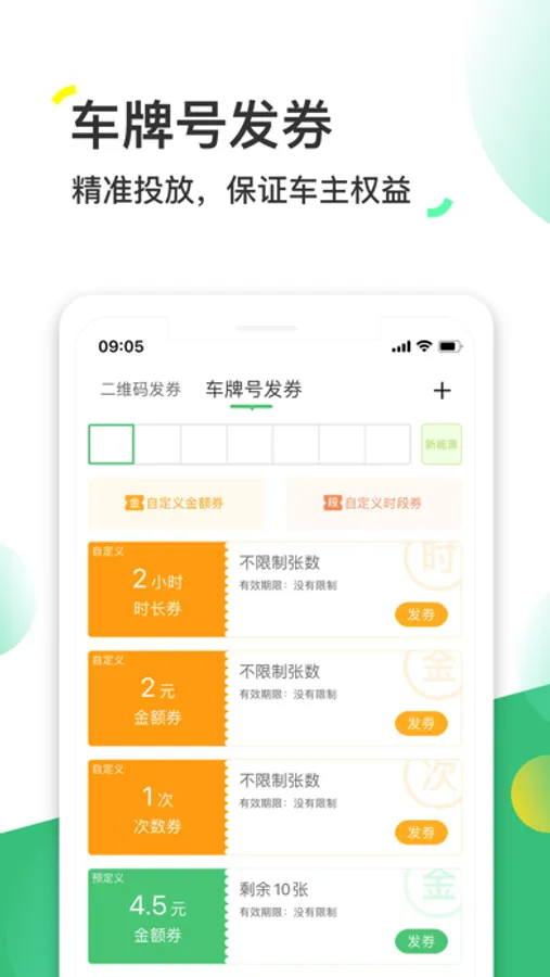 在使用了停车王停车场管理系统的商业体可以安装使用,操作员输入用户车牌一键发放优惠券,让您的客户车主实时享受停车优惠。
