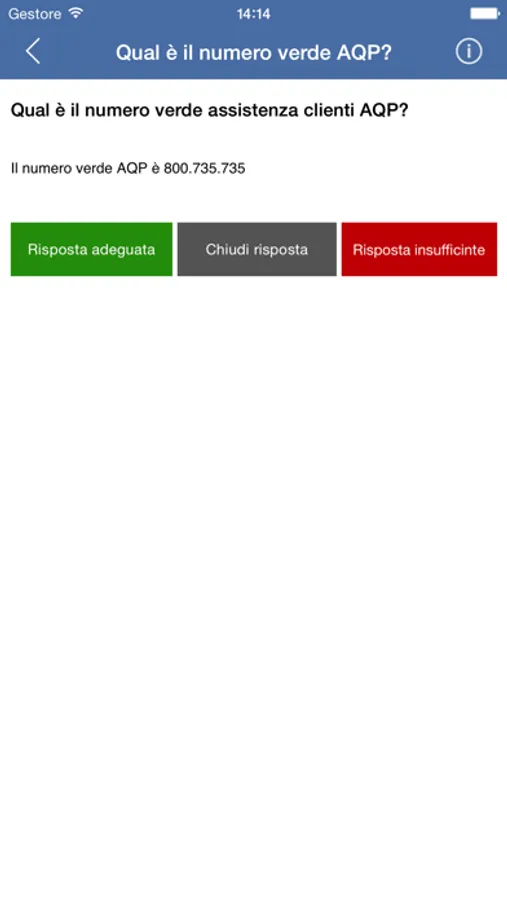 Se tra le domande e risposte che il sistema ha trovato per te hai ottenuto le informazioni che cercavi esprimi un giudizio positivo cliccando su "Risposta Adeguata". Se invece tra i risultati della tua ricerca trovi domande che reputi non attinenti alla tua richiesta clicca su "Risposta Insufficiente". Per non esprimere nessun giudizio utilizza invece il tasto "Chiudi Risposta".