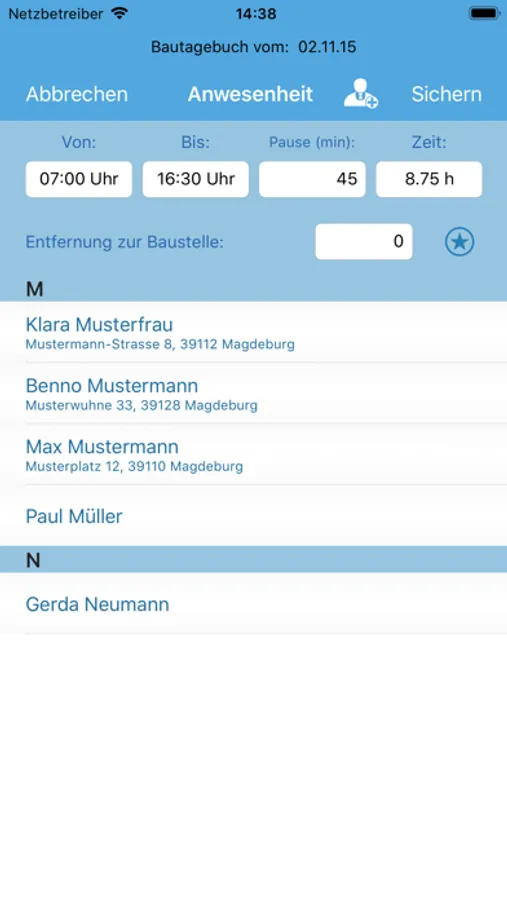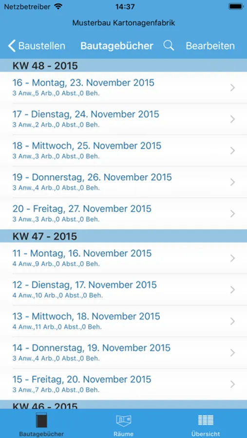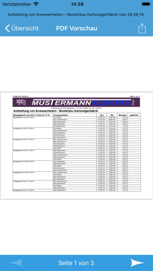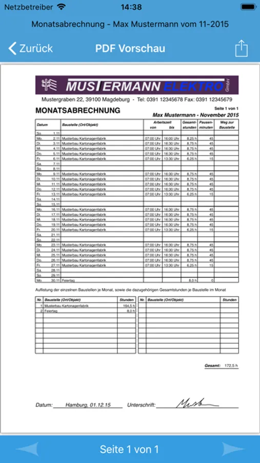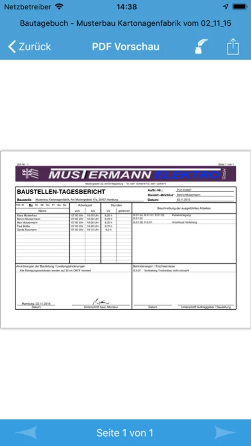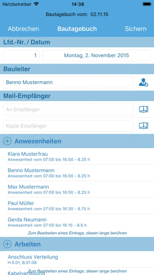 The construction diaries can be signed directly in the app by the client. Where the customer signature is not saved but for privacy reasons directly written in a PDF. If a day's wages bill signed by the client is processed, the customer's signature will be lost.