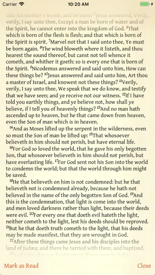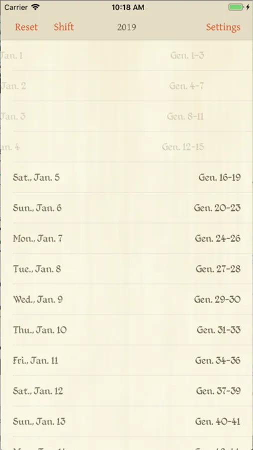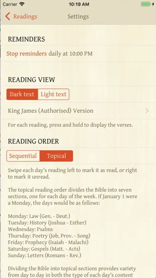 The readings are presented as a checklist to aid in tracking progress - simply swipe each day left to mark it as read, or right to mark it unread. Use the app as a checklist with your own Bible, or press and hold to display the day's reading right in the app.