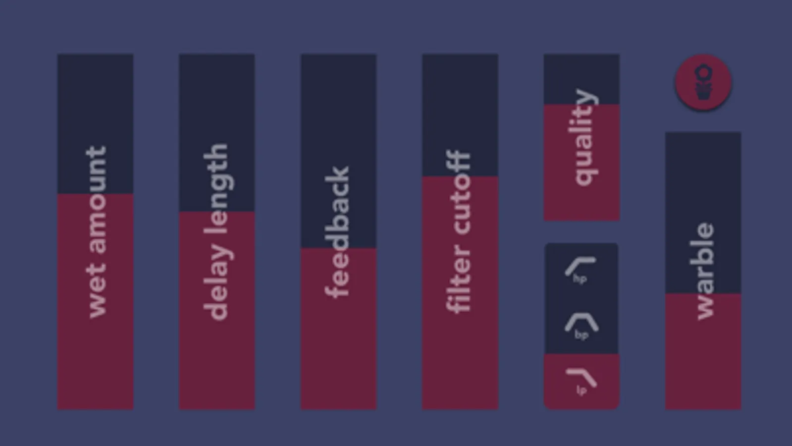 Dahlia Delay is a tape style delay effect with filtered feedback and warble amount controls.